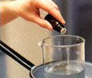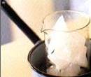 2.将石蜡碎片放入烧杯中,再将烧杯放入盛有一半热水的平底锅中,小火加热平底锅,至石蜡完全熔化。