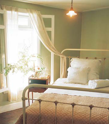 简洁卧室重新焕发自然感觉 线条 简单的铁床、没有过多图案装饰的 窗帘 ,整体感觉柔和却不繁复的床头柜,呈现在眼前的是一个简洁的法式风格卧室。在墙上粘贴给人以明亮感的淡绿色图案壁纸,靠垫、床单等用品上也有浅绿色的精致印花,以及淡黄色的绗缝效果床罩??具有自然感觉的颜色共同成就了一个完美的MIX&MATCH卧室空间。 |