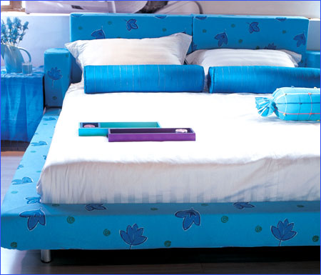 用蓝色的印花布将床包装起来,再做上几个靠枕,就可以在这里织梦了。