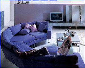 浅蓝色的 沙发 套和浅蓝色的 沙发 靠垫协调一致 蓝色的 布料 使居室显得格外宁静 |