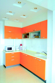 美味的橙色餐厅 在2005年的家居流行研讨会上,橙色被认为是最流行的色彩。穆女士的家用橙色装饰厨房,可谓整套居室的点睛之笔,它充分展示了女主人对流行色彩的前瞻性和大胆的表现力。如果说现代式简约风格的设计过于普通,过于大众化,那么大胆运用色彩将让居室变得不普通。