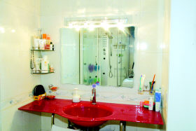 从色彩心理学上讲,橙色是能引起人食欲的色彩,整套橱柜采用了橙色,使之成为餐厅的主色调,首先从视觉感官上,在以白色和深棕色为主色调的整套居室中,橙色无疑成为了亮点,也因此使餐厅成为了整套居室的亮点。 厨房与餐厅没有任何的阻隔,使整体空间自然流畅,将欢快活泼的橙色融入如此自由的空间,让人有一种富足、快乐、幸福的感觉。 感性的红色浴室 色彩和表面的效果决定了房间的基调,而用红色作为浴室的主色调,大胆而超越平凡,即使是最挑剔的目光,也会为之侧目。当然,穆女士的浴室主要以一张红色的 洗手盆 为主,因此并非过于张扬。