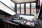 一侧斜斜的屋顶上开了大的窗户,与墙上的窗户连成一片。想是在晴朗的晚上,可以在这里奢侈地看星星。窗下,是海晨的工作台,放得很矮,背景是窗外的风景。桌子应该是一块老门板安上四个粗壮的钢腿,朴拙以外还很现代。
