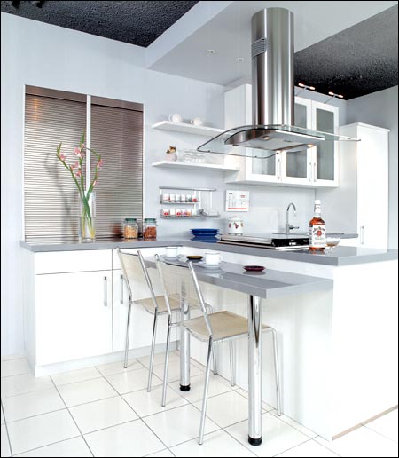 采用富有现代感的不锈钢为台面,门板为 喷漆 工艺。由于体积小巧,你可以根据需要在客厅把它做成开放式厨房或直接放入厨房之中。