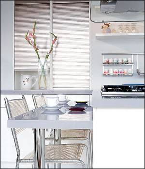 与传统的岛式橱柜相比,它没有周围的壁柜,仅仅是一个小岛而已,这样它占用的空间不到传统岛式橱柜的一半。银灰色的不锈钢踢脚板、不锈钢的台面和烟机相映成趣,白色的面板和鲜红的墙面形成颜色的强烈对比。简洁的造型配合金属横杆拉手显得简约现代,明亮的阳光透过白色百叶窗洒在工作台上,充满了生活气息。