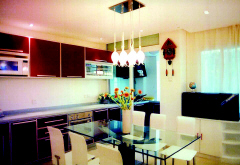 设计:阔达装饰公司大钟寺分部 张旭 电话:82612651 62581673 本案由于厨房的面积较大,又与阳台相接。设计师将一部分阳台融入厨房,为将厨房的大部分面积划为就餐区。功能环境如此划分看似简单,却体现了设计师基于简约、追求实用的大胆创意。以主色调为基准选择的餐具与 吊灯 ,使就餐区在大环境里脱颖而出。多功能柜上放置了音响,为就餐增加了浪漫的气息。 |
