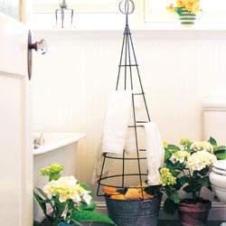 将花草与垂下长长枝蔓的植物摆放在一起,洗浴也要尽享清凉。不过,为了结合通风与光合作用,最好将浴室的植物在室外放置两至三小时,以下午时间为宜。