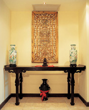 一进王芳家的大门,古朴和喜气同时扑面而来,一个“喜”字的镂空牌匾,王芳给它起名叫“开门见喜”,就像我们小时候看到的“抬头见喜”的对联,只是换了一种形式的喜气。 家里有20多个地方安装了中式的花窗,每一个图案都不同。花窗的选择是他们偶尔在小店看见的,于是王芳灵感一闪,用了40%的实样加60%?的想象,自己画出了几十种样式去订做。这些花窗是体现房子风格的支柱。不仅增加了家中的气氛,同时也起到了 隔断 和遮蔽的作用。在大大的厅里,中央空调的出口处让人看着很别扭,王芳灵机一动,便在那里装了三个落地的中式方格,不仅看不出装饰的痕迹,还与屋里的风格自成一体。同样,玄关与客厅也被三个同样的落地中式方格隔开。