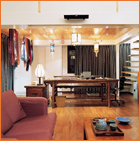 程潇家的设计师付滔是夫妇的好友,她为这里打下了实用的格局。二层原有格局在她的设计中重新划分,拆除三间卧室,让它们获得开放,成为主人的视听区和阅读区。而在局部区域添加的一层,常是程潇冬天午后的另一个卧室。 体现中国文化注重内在、含蓄隽永的内庭院颇得程潇夫妇的喜爱,为了更大限度发挥内庭院的魅力,设计师在书房的墙上洞开一窗,使得内外空间有阳光和景致的交融。书房、庭院和客厅三个空间各自独立,但又相互呼应,通过玻璃门窗可以遥望到彼此,这样既开阔视野,又可以充分利用光线,达到事半功倍的效果。喜爱呼吸清新空气的夫妇在那里种几株翠竹,置一把藤椅……庭院翠绿的竹子隐约可见,室内的绿萝、香草植物带来大自然的气息,来自心灵内部的沉静和安宁在这里得到最充分的释放,与好朋友一起品茗谈天,抑或在夜晚仰望苍穹,可以享受时间悠然地划过。 古典与现代 如果把红色的范围加以扩展,那么洋红算是一种既传统又洋气的颜色了。一大把洋红色的风信子在玄关处迎接着主人的到来,如美人的朱唇,只那淡淡的一抹却是最有魅力的所在。书房里浪漫的紫色绸质 窗帘 散发着神秘的气息。最出位的是楼梯处的墙壁,蓝色墙面配以水晶灯,是宁静的精致在闪耀。 “食浴主义” 来过程潇家的人,都迷恋她的客厅、内庭院、视听区、老家具、艺术作品、小收藏……却不曾深刻体会到程潇家的厨房和浴室的舒适。 大多数人很难将浪漫气质与吃饭这样的平常小事联系在一起,但是吃过程潇做的饭和烤的蛋糕的人就会知道厨房是她另外一个施展才华的地方。生活追求的是品质,不仅要吃得舒服,而且制作食物的过程也要心旷神怡,程潇是这么认为,她的设计师很好地将她的愿望实现。程潇家的厨房让很多人惊讶,那是一个功能完备的大厨房,灰黑、不锈钢和白主宰着那里,散发出完全的现代气息。程潇爱做饭,常常沉溺其间,时有美食香气。朋友去程潇家作客,除了欣赏那里午后阳光下沉静的家具、桌几上的旧物、心里还惦记着她烤制的蛋糕。 卫生间里,设计师别具匠心地将墙壁、天花板使用木条,配以雪白质地的洁具,让主人仿佛置身于广袤的森林,呼吸着带有松节油味道的清新空气。柔和的灯光加之整面墙的镜子使整个房间的空间感得到延伸。浴室是最隐私也是最能体现主人生活情调和品位的空间,在原木设计中,程潇夫妇将音响悬垂在浴缸的上方,一整天的疲倦随舒缓的旋律消失在葱郁森林的远处…… 喜爱猫的程潇说,爱动物的人爱生活。其实也只有爱生活的人才会去筑造生活,懂得品味生活。对待生活的态度决定了对家的设计要舒适要安逸,邀三五知己聊天,或养花护草或静心读书,与古典同在,与文化同在,与自我同在,程潇的生活如是。 |