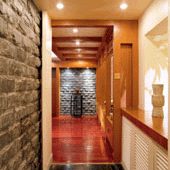 因为我自己喜欢中式,所以当然没必要把大家一起聚首畅谈的客厅全部都打造得古色古香,只做了局部点缀。白色的墙面、灰色的 大理石 地面、黑色的皮 沙发 和茶几,硬朗的曲线打造出粗 线条 的简约空间。在这个空间里,父亲随意将自己的收藏品摆在其中,让它很自然大方地呈现家具和材料本身的质感、色泽,没有风格可言,却让客人觉得舒服。 餐厅带着欧化的情调,餐椅的背是深红色,如葡萄酒般,浓郁、煽情,樱桃木的质感既柔软又有弹性,都说人体工程学,其实在最恰当的地方用最恰当的材料,本身就已是“人体工程”了。与之相邻的“酒墙”不辱使命,存放了来自世界各地的美酒,美酒配佳肴,自然不醉不归。 客人们待得最多的地方就是餐厅以及旁边的棋牌室。父亲喜欢下围棋,所以特别布置了棋牌室,这个房间以棕黄色为主,墙纸经过特别处理,有着竹帘一样的视觉效果。棋牌室的桌子特别有意思,环环相扣,最上面一层面板用来打麻将,取下来就可以在第二层面板上下象棋,把第二层翻转过来又变成一个围棋棋盘,把它揭开,最下面还能下斗兽棋。这种做法据说源自古代,是个名师的作品。
