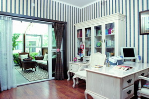 书房是相对私密的空间,所以,虽然在一层,主人还是选择了更为舒适和放松的美式风格,地面也变成木地板,每一个空间都是相对独立自成系统的。走过书房后是明媚的阳光房,韩先生将花花草草侍弄得极好,就像被包围在一个大花房里的玻璃屋。