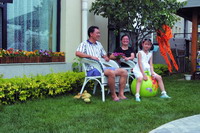 美式的桌上足球,在家居的布置中是很少见的,在这间绿色掩映的阳光房里,无论是中式的藤椅,还是可爱的飞镖,主人就想要个快乐的空间。 一层众多的窗子,早已将庭院的绿意透进了一楼的每个角落,但主人仍嫌不足。穿过装着壁炉的书房,是一间以木为壁、以玻璃和透光帘为顶的阳光房。宽大藤椅和粗野的非洲手工雕刻相映成趣,活泼的主人还在这中间安置了一套桌上足球,我们的耳边仿佛马上响起了他们比赛时噼啪的声音和欢快的笑声。这样轻松的布置带来的一定是同样轻松的家庭氛围。花园也被打理得很好,花儿郁郁葱葱地快乐生长,走进它,呼吸都变得清新起来。主人非常喜爱侍弄这些花草,同时,一个朴素又生动的家居空间,也被主人这样一点一滴地打造出来了。 窗外是6月里金色的阳光,却没有主人脸上的轻松恬静和幸福更有光彩。