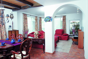 主人资料: 主人没有一味地采用欧式家具和装修,而是在客厅、楼梯、厨房、过道等处匠心独具地运用了一些欧式设计符号,让整个家充满了中西交融的和谐之美。 韩先生的家是跃层的结构,所以处理的手法也很典型。就拿地面来说吧,一层是浅棕色的巴西瓷砖,而在通常的情况下,欧洲人喜欢把这样的砖用在别墅中。进门从玄关开始,一直铺到客厅尽头的窗子下,甚至一层的墙围都是用这种瓷砖包起来的。另外,虽然是同一种砖,但在整体上采取了大小不同且斜铺的方式,使得地面统一而且丰富。为了让功能空间在地面上有所区隔,主人只在客厅中放 沙发 的一部门面积里换上了有石材纹理的瓷砖。所以整个一层的格调统一而明晰。书房、卧室、儿童房这些日常起居的地方,则是木地板,这种地面的铺设方式是比较符合欧风的基本形式的。 除此之外,主人并没有一味地采用欧式家具和装修,而是在客厅、楼梯、书房、浴室等处匠心独具地运用了一些欧式设计符号加上一些中式的元素。青石地面上高高的青花瓷手盆,正对着玄关的一扇玻璃窗像画框一样,把满园的姹紫嫣红框了进来。阳光肆无忌惮地投进临窗的会客区里,坐在暗红的欧式 沙发 上,整个家充满了中西交融的和谐之美。