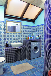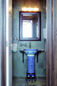 单从视觉上看,就知道浴室是主人花了很多心思的地方,一中一西、一简一繁,正是主人丰富却不繁琐、唯美又不张扬的心境。 一楼的客卫,基调是一片蔚蓝,蓝色的马赛克、灰蓝色的 地砖 。因为空间相对较大,所以主人就有了很大的发挥余地,为洗衣机量身定做的小台,上面还可以放一些杂物,弧形的洗手池、手盆与同样造型的整体浴房呼应着,“整体浴房”其实是主人自己用砖砌出来然后贴上蓝色马赛克做成的。大面积使用马赛克,并在顶部铺上了温暖的桑拿板,刻意做成的斜屋顶式灯箱是主要 光源 ,设计的本意是希望为这个没有一只窗子的卫生间,带来一种有天窗的感觉。镶嵌在墙上的镜子有着精细的金色勾边,大气而纯正的欧洲风味呼之欲出。 二层的主卫,是纯纯的中式传统风格,主人说:“其实这样做只是因为这个卫生间太小了,采用中式的设计,可以让卫生间看起来更大一些。”的确,中式的木桶自然比平常的浴缸更省地方,青瓷的大碗和胆瓶有一种淡然的韵味,墙壁上贴着《水调歌头》:“起舞弄清影,何似在人间。转朱阁,低绮户,照无眠。”不是为这个空间做了个注脚吗?