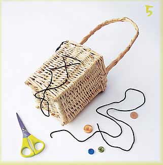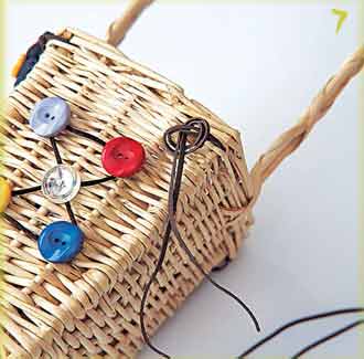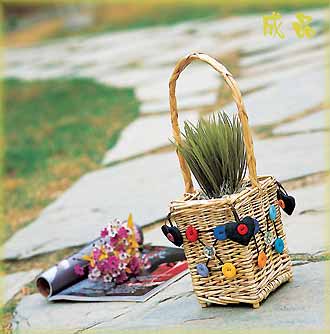 ![]() 竹编花篮、 万能胶 、针线、牛仔布(或花布)、脱脂棉、扁皮绳、粗丝绳、各色纽扣、剪刀 ![]() 竹编花篮、 万能胶 、针线、牛仔布(或花布)、脱脂棉、扁皮绳、粗丝绳、各色纽扣、剪刀 ![]() 将剪好的布片正面相对,沿着边缘缝合,缝到大约四分之三位置,留出大约2厘米填充口便于稍后填充棉花。 ![]() 把缝好的心型翻转过来,从刚才预先留好的填充口往里放少量棉花。棉花不用放太多,否则不便于最后收口。 ![]() 按上面要求填充好所有心型,并依次缝合留口。缝最后一针时注意藏好线头。 ![]() 将粗丝绳编在竹篮上,编结的图案不要太复杂,最好以直线为主。有弧度的图案不容易操作且效果不好。 ![]() 选出和竹篮颜色相配的纽扣按设计好的图形用 万能胶 粘好。选择的纽扣不要太小,因竹篮有编结缝隙,小纽扣不容易固定。 ![]() 将皮绳系在竹篮的四角。 ![]() 把皮绳和做好的心型叠放在一起,选一颗小一些的纽扣缝在最上面,将长出纽扣的皮绳剪掉。 ![]() 竹篮四面都制作好后可以在提手部分用剩余的皮绳加以简单修饰。或缠绕或打结,都可以丰富装饰效果。 ![]() 制作成品 Tips提示: a.买来的竹篮在制作之前要先修剪一下,以防在制作过程中划破手。 b.如家中没有脱脂棉可以用细棉线团成蓬松的线团代替棉花。扁皮绳和粗丝绳在美术用品商店有很多颜色及款式可供选择。 c.粘扣子时最好不要用双面胶代替 万能胶 ,否则以后花篮脏了刷洗时扣子遇水会脱落。 d.除了竹篮外,不用的竹筐、草编包、草帽等都可以制作成花篮,而且会更为别致。 |