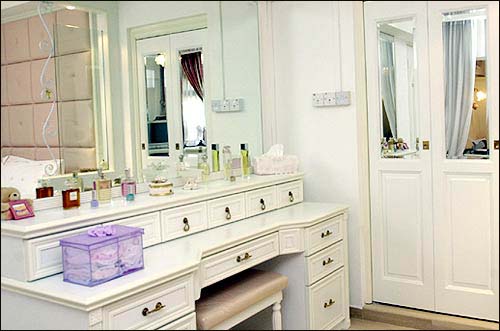 每个女子都希望把自己打扮得漂漂亮亮,梳妆台怎可少,“量身定制”的梳妆台,隔起大大小小的抽屉,让喜欢收集化妆品的女主人整齐的把口红、腮红、粉饼收藏好,白色的梳妆台上端是一整大片镜子,木质化妆台不同角落浮凸调花,增添美感。