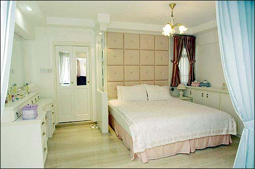 白,是女主人最爱的颜色,以白和粉红为主色系,宽大的床头是整片粉红真皮,搭配白底粉红绣花床盖,柔和娇美。