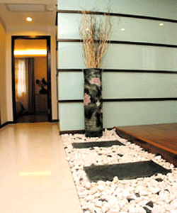 茶厅:精巧文雅,自然舒心 客厅通透的展示柜的另外一边,就是大约10平米的小茶厅。和客厅富贵沉稳的风格不同,这里是一片自然清新之气。最别致的地方是茶厅的入口,虽然茶厅是完全开放的空间,中间并没有墙体 隔断 ,不过在走廊和它完全开放的入口处颇具匠心地设计了一条石子小路。它大约一尺见宽,白色小石铺垫其间,间杂些许黑色鹅卵石,仿佛小溪流后浅浅的河滩,白色小石中间有三块黑色板石,连接了走廊和茶厅,它们就好像是过河的小桥。这短短一段小石滩路,还有点日本园林枯山水的味道。白色小石路的尽头立着一个直筒大花瓶,上面写意的手法氤氲着大团的墨绿,粉嫩的荷花,活泼的黑鱼,水波荡漾更有一路沿河滩走到池塘、蓦然柳暗花明的感觉。 大花瓶背靠的是空灵轻巧的玻璃墙,上面又用木线隔出了道道,不是那么愣那么板。本来在玻璃墙的下面是要植点绿色的竹子,不过看看现在的效果已经够好,就不再需要锦上添花了。 小茶厅是用木板立起的一个小榻榻米,从黑石板走过来,仿佛跨过河溪上了岛。茶厅仅一桌四椅而已,藤编的家具非常轻灵,造型却延续了客厅的沉稳华贵,靠背扶手都宽阔舒服。“客厅太大了,人少的时候说话实在不方便,不如在这里边喝茶边聊天,舒服又惬意。”李先生说。而李太太的另外一大爱好就是饮茶,而且对功夫茶艺还颇有研究呢。夫妻两个都爱交友,亲戚朋友来了,坐在安静的小茶厅里,品着李太太热水烹调的茶,看着窗外近在咫尺的森林,诉说一段陈年往事或是近况心得,委实不可多得。 书房现代元素,低沉静谧小茶厅的对面是楼梯,同样是低沉的黑棕色调,扶手却是镀膜光亮的不锈钢,材质和色调都反差很大,对比明显。楼梯本来不是正对茶厅的,而是对着正进门的位置,也就是现在的主题墙位置。这么一来客厅就成了不完整的空间,经过改造有用空间就多了很多。二层出了楼梯两个卧房夹着的空间被用做书房。拾级而上,抬头看到的是一色的暗金红,那是书房和楼梯转角统一的专用墙纸。在挑选的时候就很费工夫,因为要营造出一种低沉又现代的感觉,色彩上要配合金属色调,效果又不可以太过光亮,以免抢夺了墙纸上拉丝不锈钢的质感,也不符合书房的静谧感觉。重重的暗金色后面隐隐透出低沉的赭红色,沉稳大气。PVC的墙纸上面独具匠心地用小指粗的拉丝不锈钢造型出“X”,一直从楼梯拐角延展到书房,覆盖整个书房顶端。本来是装饰用的元素却成功加入到房屋结构,金属元素既成为吊顶的一部分,又为书房增添了静谧现代的感觉。吊顶的灵感来自于工业建筑的钢构架,设计师觉得李先生夫妻年纪虽然人到中年,可是工作性质和个人气质都比较现代,适合加入金属的元素。他和李太太夫妻沟通了好几次,使他们接受了自己的想法,也根据主人的使用要求和气质做了相应的修改。把公共建筑的装饰元素运用到私人空间,大胆的想法和做法使得书房成为了李太太家的一个亮点,不少朋友只要一走上楼梯,就会赞叹这独具匠心的创意。当然具体施工的时候拉丝不锈钢也是订做的,毕竟家和公建的尺寸还是有区别的。从楼梯正对的大窗户边看着整个书房,圆球 吊灯 柔和了金属的冰冷感,以及见棱见角的空间,让整个房间也呈现出些许loft的风味。 厨房房间虽小,改动最大李太太家的房屋结构除了楼梯之外并没有大的结构改造,只有在厨房里却是大大动了一番干戈。原本的厨房是一个细窄的长条,里面有一间4平米的保姆房,改造后把保姆房的墙打掉,扩展成为可以放下一张大餐桌的餐室。原本的上下水弯了一个大圈改道,由靠西变成了靠南,靠西的墙面订做了整体的橱柜,什么微波炉、烤箱、杂物柜、碗盘都放在这里,还专门为电视留出一个大空间,可以一家人围坐时解闷评论。改道到南面的上下水当然是为厨房的操作台准备的了,也是和西面一起订做的橱柜。餐室主色为白色,吊顶也颇费了点功夫。用的是 铝扣板 ,但是比一般的 铝扣板 要宽要厚,颜色也是洁白的,这样“清洁起来方便。而且,我们家的厨房不是摆来看的,是经常要用的,当然要费点心。”李太太这么解释。厨房不到15平米,却能够花去所有装修经费的大约1/3强,光是那一套订做的整体橱柜,就要7万元,这还是李先生和别人相熟打了折扣的呢。 设计师心得:沟通调和出美满家居 和主人的沟通的确是一件非常重要又麻烦的事。设计和施工过程中成功和不成功的例子都有。比较成功的就是书房的装饰设计和金色的运用,因为主人夫妻都是人到中年,从事的行业又都是非常现代的,所以我觉得使用金属元素比较合适。但是我的灵感要被他们所接受还需要一个过程,好在这个比较符合他们的气质爱好,所以顺利完成。我的想法实现了90%,他们也很满意。在主卧室里我原本打算设计一个开放式的浴室,和卧室连为一体。但是与李太太再三沟通,他们从想法还是接受不了,又怕以后使用起来干湿区域不分,房屋内部产生水蒸汽等问题。其实这些都是可以解决的,但是这个想法他们这个年纪的人接受有点困难,我最后只好放弃。沟通得不顺造成返工,影响效果的情况也有。比如客厅电视柜底下的鹅卵石,施工人员把它做成了石林的样子,每一片石头都立着,后来只得返工。小茶厅的白石头路我本来是打算做得更加彻底一些,后来李先生提出不好打扫,才中和成了现在的效果。总体来说,沟通就