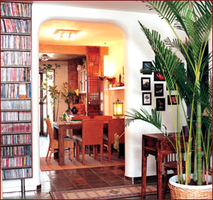这个家流动着异域格调,融合了东南亚风情、加勒比海浪漫及北欧优雅风范。这个家令人心动,让人恍惚:南国的庭园,也可以进驻钢筋水泥丛林?清凉圆润的片岩地面,各种绿色植物掩映在木和藤质的桌椅、橱柜之中。顺着绿色竹木小径,来到晨光明朗的阳台,满眼绿色植物,缠绕着暖椅。阳台小风拂过一阵清香,是膝边的迷迭香……男主人叶力端上绿茶,茶杯形状和颜色都不同,每一款都值得再三赏玩。