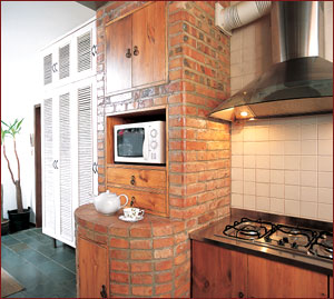 厨房是开放式的,用一扇窄窄的旧木门与餐厅分隔。罗雪说,有了 隔断 ,房间才有层次和节奏,就像音乐有了篇章。厨房的生气是一个小小的热带鱼缸,几条斑斓鲜艳的鱼自在地吹着泡泡;厨房的巧智是红砖砌的灶台式壁橱,风格粗犷憨实,灶台肚子和炉灶烟囱都藏有抽屉,既特别,又方便收纳;厨房的不俗之处是屋顶,保持了原有的水泥表面,刷上清漆,色调与地面呼应。橱柜都是木质的,铺了不锈钢台面。