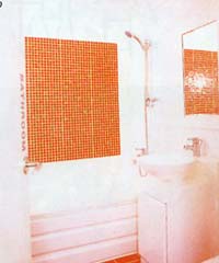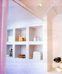 淋浴间的墙壁被加厚,然后再做出方形的内龛,这种方法既增加了隔音性,也使洗浴用品得到安放。