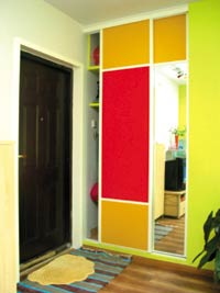 主人在门口打制了一个壁柜,替代了衣柜,这样就将卧室中放置衣柜的位置空出来,使空间不显得拥挤。