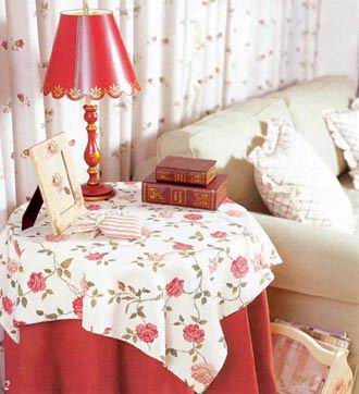 在 沙发 旁边的小边桌铺上一块红色棉布,再加上小块的玫瑰图案桌布,即突出玫瑰桌布的美丽,在居室中也显得十分协调。 让大朵大朵的玫瑰盛开在居室里,让醇烈奔放的浪漫情怀一触即发,你的爱意就这样不经意成为家的一部分,无言地向你深爱的伴侣脉脉倾诉。玫瑰境界之中,你们情醉、情暖、情牵…… |