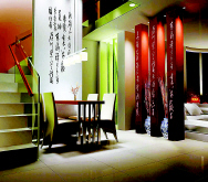 崇尚后现代主义的设计理念,利用楼层间的通道做了一个妙趣横生的餐厅。通过不同颜色之间的关系和装饰性文字的点缀,使这个现代风格的环境中,充满了浓郁的书香气息。