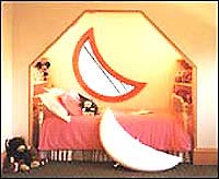 非凡的装潢特色,几乎立刻就能在孩子的房间内产生一种欢乐的聚会般的情调。这里,天花板上悬挂着彩色顶蓬,使人联想起看马戏时的快乐和激动。房间那艾丽斯漫游奇境记中的风格,被两支竖立的巨大铅笔改变了。一位小小艺术家随时可以坐下来,只要将墙上的纸卷扯一张下来,就可以一本正经地开始涂涂抹抹了。