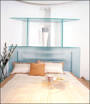 主要材料:弧形玻璃可选用磨砂、双层玻璃中间磨砂、或其他种类的玻璃,好看的玻璃种类很多,可以按自己的喜好和造价考虑选择。如果是单层的玻璃要做钢化处理,比较安全,而夹胶玻璃就不用了。 透过虚掩的纱帘,能看到卧室内部的舒适场景。 从正面拍摄的床以及床头的设计。在这种狭小空间中,床基本以矮榻的方式设计,给人一种安全感而且不会让狭小的空间显得过分拥挤。床头的玻璃设计呼应玻璃墙体,而且将灯巧妙地藏在玻璃后面,保证 光源 而且不影响美观。 两个入口让空间显得开放而通透,空气在居室中自由地来去。 |