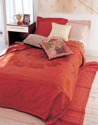 女性化的房间总要追求温馨浪漫,这是一个充满民族色彩的空间。在带有刺绣花纹的物品之中,充分融入了民族味道。选择雅致的红色物品,也能营造出高贵的空间氛围。 窗帘 应选择加入金线质地轻薄的蓝色 布料 ,墙上对应地选用柔和色系的 布料 ,借以减少床周围的沉闷之感。感觉是否像印度公主一般,如果是成年女子,试着选用这样既沉稳又浪漫的花色吧。