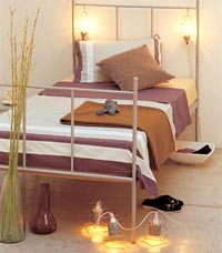 悬挂灯可以安放在床边。灯亮时,映在墙上的放射线很漂亮。金属灯的造型很可爱,照着床角的方式也很新颖。