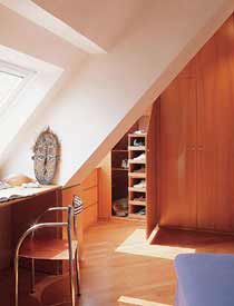 “斯是陋室,唯吾德馨”。抱着这样的念头,我决定把阁楼好好地布置,完完全全地体现自我。 阁楼的吊顶和地板采用了 木材 的本色,这让我仿佛置身于丛林木屋,耳静,眼静,心静。但我的个性可不会淹没于这种平淡之中。书房家具的鲜艳颜色与别致造型,是我匠心独运、亲自动手的成果。 首先请看我的书架。用磨砂钢板“拗”造型虽然“宜家”早已有之,但我的书架造型是由我设计的,独此一家,绝无“拷贝”。再看画面右边的冰箱。你一定想不到,拉开门,里面放的不是食品,而是一格格的木搁板,上面放着不常用的参考书与办公用品。其实,这是家中用了十多年的老冰箱,制冷效果不好,噪音又大,我就拿来废物利用,重新漆上明黄色的油漆,内部进行了改造,成了书房的储物柜。冰箱旁边还有我的一个“绝活“:一张圆形坐椅。知道它的“前生”是什么吗?一个工业用油桶。 很多单身的朋友跟我说:他们最大的快乐是装修时可以完全凭自己的喜好来决断。而我要说,已婚有家的人装修,最后的结果是家庭中每个成员相互妥协的结果。但这种妥协也是一种甜蜜,就像我的“陋室”。看着因我的努力,父母可以住在朝南的大房中沐浴阳光,妻子可以在宽敞的厨房中展示厨艺,孩子可以邀请小朋友来家里玩,这些都是真实的幸福。而我的“陋室”逐渐成了我和妻子交流的私密空间,以及我和孩子一起做航模的天地,这又是幸福之外的幸运。 阁楼的吊顶和地板采用 木材 本色,让人仿佛置身丛林木屋,“斯是陋室,唯吾德馨”。 |