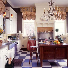 蓝白相间的 地砖 ,图案缤纷的 窗帘 ,造型优雅的 吊灯 ,生动活泼的厨房。 |