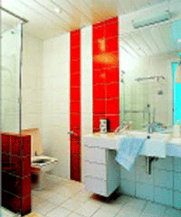 次卫乳白、红色的墙体,辅以颜色相近简洁的图案,在柔和的、浪漫的灯光映衬下,不仅使空间视野扩大,暖意倍增,而且愈加清雅洁净、怡心爽神。 |
