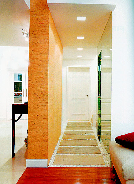 这个走廊很短,几乎还没走,就已经到头需要转弯了。在端景的处理上,主人明显用了借景的手法,门被当成了一个画框。 连接家中的几个功能空间,从客厅到卧室,从卧室到餐厅,当然是走廊的任务。在家庭空间中,走廊除了连贯之外,还有 其它 可以承担的功能,那怎样使以迷人为终极任务的走廊出彩呢?几个不一样的案例,也许能给你一些启示。 把走廊变成厨房,这个建议你想过没有?除了要解决下水和排烟的难题,走廊的长短也是问题。总之,这是特殊情况下的特殊用法。三月 在走廊的地毯上另外铺置了几块方形毯,摆成楼梯的格式,让每个步入者都有些空间错落的感觉,很奇妙。 主人很喜欢现代时尚的生活,同时对中式风格也有兴趣。墙上的海报画,虽然是一把椅子,但却有两种截然不同的表现。既符合家居风格,也借别人的口说出了自己的品位。