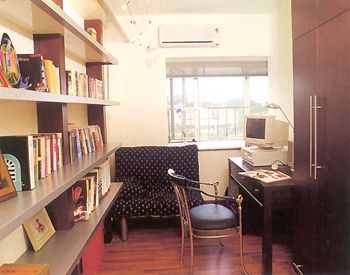书房内开放式书架,胡桃木的立柱,隔层衬板为18寸的夹板裱上铝板,结实耐用,非常易打理,拿取书方便且藏书量大。 |