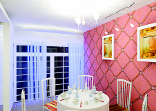 客厅:会客区与餐饮区的巧妙划分是现代住宅装饰设计上的一个重点和难点。本案设计者用三个矩形 隔断 将空间分为娱乐与餐饮两区,而整体上又是一面创意巧妙的电视背景墙。暗红色墙纸给空间平添了一分激情和柔美, 隔断 上五条平行的 线条 避免了其“细长单薄”的视觉反差。