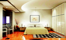 卧室:卧室装饰设计应追求“静、雅、柔”的效果,但也不排除整体感和宏大气势的营造。在本案设计中,设计师以两排双层立柜为主要元素,追求卧室在视觉上的统一。刻意的 光源 设计,突出了卧室用来休息、看书、交流的三大功能。屋顶弧形 灯池 的设计,给空间平添了一分柔美。