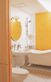 与卧室连在一起的浴室,面积相对宽敞,所以放了移动式浴缸,带来了新意。墙面用温暖的黄色瓷砖装饰,放置浴缸的地面部分又加以区别,看起来更加温馨。
