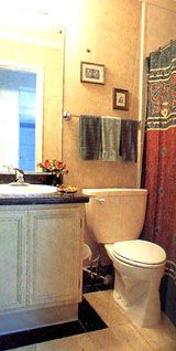 “方寸之间体现品位”, 这句话是江南裁纸常说的,拿来形容这个卫生间小角落的处理很贴切。多数小空间人家的卫生间都不怎么设计,最多是打理干净。江南裁纸就做了这么一个小柜子,就比让洗脸盆裸露着美许多,处理一下墙面,空间心情就不一样。这个卫生间也就3平米左右,可是,一块漂亮的布一拉,就不知道空间到底有多大了。 小空间的处理有各种各样的方式,挂画就是其中一例。这幅画并非随意而挂,存在于画面中的空间使这个12平米的小空间显得大了许多,挂这样的画,一定要注意尺寸,太小了不能产生扩张空间的效果,画幅尺寸最好与正常视觉差不多。关于这一点,江南裁纸的理论是:视觉空间产生于错觉,制造错觉是对设计师能力的检验,尽管视觉空间其实并不真实,但是,心理的感受却真实无疑。