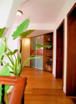 利用顶楼的优势,宁先生在天台加建了一个阁楼作为客房。发展商出于使用方便的考虑,把顶楼房梁全部做成“倒反梁”,即房梁没有出现在屋子里,却突现在天台上。宁先生因势利导,根据房梁高度将天台客房的部分地面抬高,做成一个“榻榻米”的区域,尤其适合三五好友聊天,同时一张大床褥便省却了买床的烦恼。客房最独特的地方是卫生间,全玻璃制成,一览无余。没有问宁先生怎么会有这么个奇怪的想法,不过我猜宁家的客人肯定因此多了不少。 |