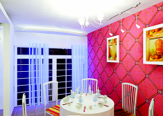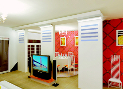 客厅:会客区与餐饮区的巧妙划分是现代住宅装饰设计上的一个重点和难点。本案设计者用三个矩形 隔断 将空间分为娱乐与餐饮两区,从整体上又是一面创意巧妙的电视背景墙。暗红色墙纸给空间平添了一份激情和柔美。 隔断 上五条平行的 线条 避免了“细长单薄”的视觉反差。