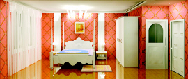 卧室:暗红色壁纸、乳白色 窗帘 、 实木地板 、银灰色家具营造的是一个飘逸的空间。 玄关:弧形吊顶造型精巧,椭圆的灯被当做工艺品摆上了精品架,普通材料创造出的艺术氛围,体现出居住者不俗的品位与审美观 |