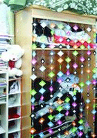 ●摆设创意一 彩色锁扣做门帘 阿簿的衣柜很有趣。为了使衣柜看起来更通透,衣柜门被拆掉后换上了一幅彩色亮片锁扣门帘。门帘由一串串被圆形锁扣连接而成的彩色方形塑料片组成,挂在衣柜上色彩缤纷,很吸引眼球。 贴士:这种装饰不仅巧妙“掩饰”了一部分杂乱,还使得取放衣物更方便。