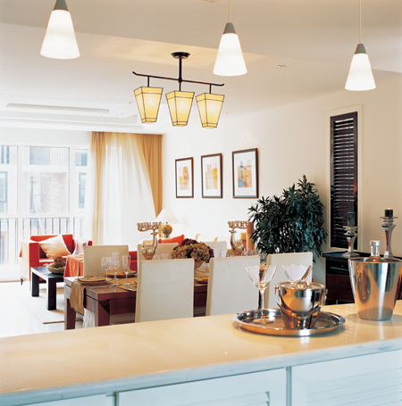 连通客厅和餐厅 与大多数复式结构的房屋一样,这套房子的客厅和餐厅也在一楼,此外一楼还有两间卧室和一间厨房、卫生间。除了南向的落地玻璃窗可以采光,在朝西、朝北的客厅墙面也有三扇窄长的窗户,采光不错,户型也很方正。厨房在客厅的北面,原本是一个独立封闭的空间,因为喜欢通透明亮的居室效果,设计者将厨房和客厅的隔墙打掉,这样一来,北面厨房的大玻璃窗给中厅又带来更多的光线,豁然开朗的空间格局,给人加倍宽敞的感觉。