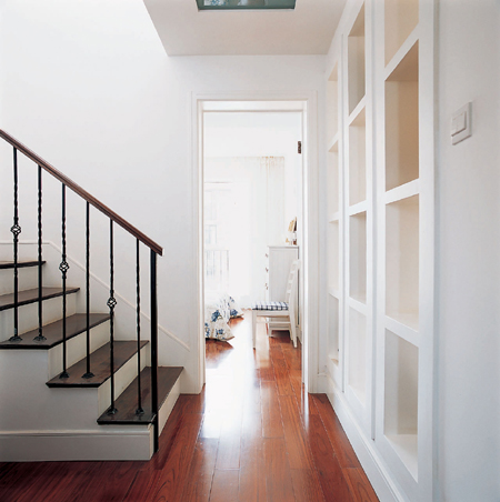 通透 隔断 ,动静分离 为了让客厅与其他房间动静分离,原来的楼梯过道与客厅之间是一堵封闭的墙,过道狭窄阴暗,视觉上也显得闭塞。设计者将此墙改造成一个 隔断 式古董架,可以摆放些装饰品,一下子也显得透亮了很多。同时,客厅的完整性和其他房间的私密性也得以很好的保留。