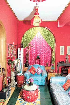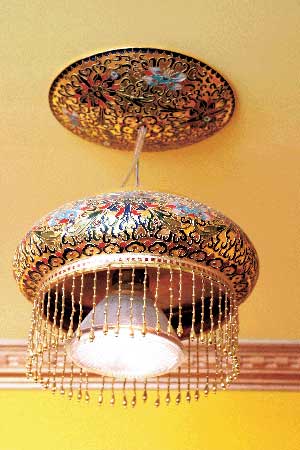 华丽景泰蓝灯 景泰蓝色彩艳丽、美仑美奂,是主人如何也割舍不下的爱物。家里随处可见用景泰蓝器皿做成的灯,用盖子做灯座,器皿做灯罩,再粘上金色的流苏,细致的主人为了色彩的统一还将器皿内部喷成了金色,光透过景泰蓝射出来变得更为美丽。