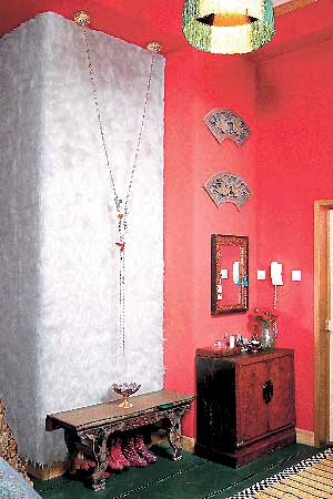 玄关不大,所以要强调它在视觉和使用上的重要性。他们给玄关装了一面镜子,一个中式柜和条凳,两条钢链从顶部垂下来,结在一起后再挂上一些小挂钩,就可以挂很多衣物,更衣、换鞋、储物的功能都轻松解决了!用人工毛皮作“墙纸”,让这个区域更突出,这种人工毛皮极便宜,在潘家园大概只有二十几块一平米,有一天不喜欢这个颜色了马上还可以换成其他的。质感草纸做壁纸 背景墙上的植物纹理是高档墙纸的效果吗?回答是“否”。这些“壁纸”是在美术馆附近买的草纸,一两块一张,各种颜色和纹理都有,感觉像很贵的墙纸一样。草纸因为有吸水性,对灰尘的吸附性也比较大,耐性与韧性都差,所以不会耐久。这些墙纸已经贴上差不多一年了,主人比较小心,所以保护得都算好,不过,他们认为也值得了,大不了再换个花样。 |