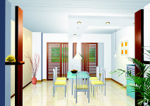 餐厅与走廊有一朦胧玻璃墙之隔,与上悬挂的艳丽金黄色壁画,再加上两盏 壁灯 光柱,轻盈立体有形的吊顶挂灯使家的感觉简洁而完美。
